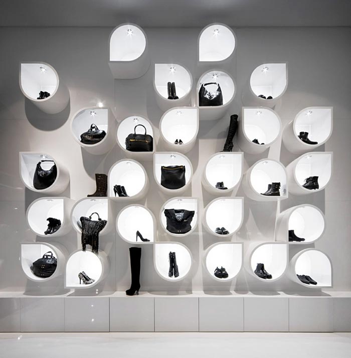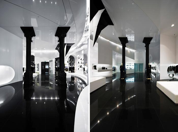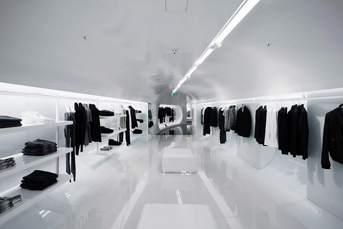 Certainement parce que je déteste fouiller pour trouver ce qui va me plaire! Moi j’aime lorsque les vêtements sont mis en valeur, que l’agencement est aéré et que l’on a de la place pour circuler… Cette boutique Capsula, aménagée par sandor gocsei + eniko korompay, réuni toutes ces qualités… Même si la décoration noire et blanche poussée à l’extrême peut sembler un peu froide et élitiste, je trouve que cette boutique design est très réussie.