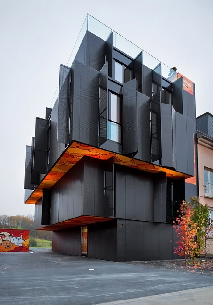 Extérieur noir, simple, mais subtilement réhaussé par le graphisme de SUMO. Graphisme qui se poursuit jusque dans l’intérieur des appartements… C’est le cabinet d’architecture Metaform qui a signé cette résidence et le fait de s’allier les services de SUMO est pour moi une très judicieuse idée. Cela donne un petit côté ludique et gai au bâtiment.