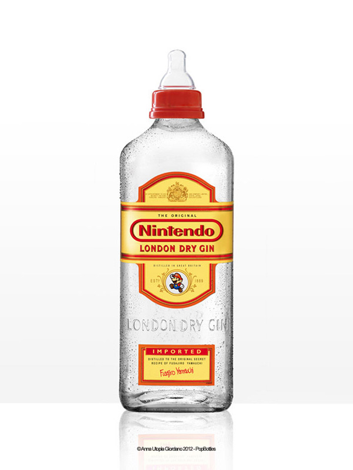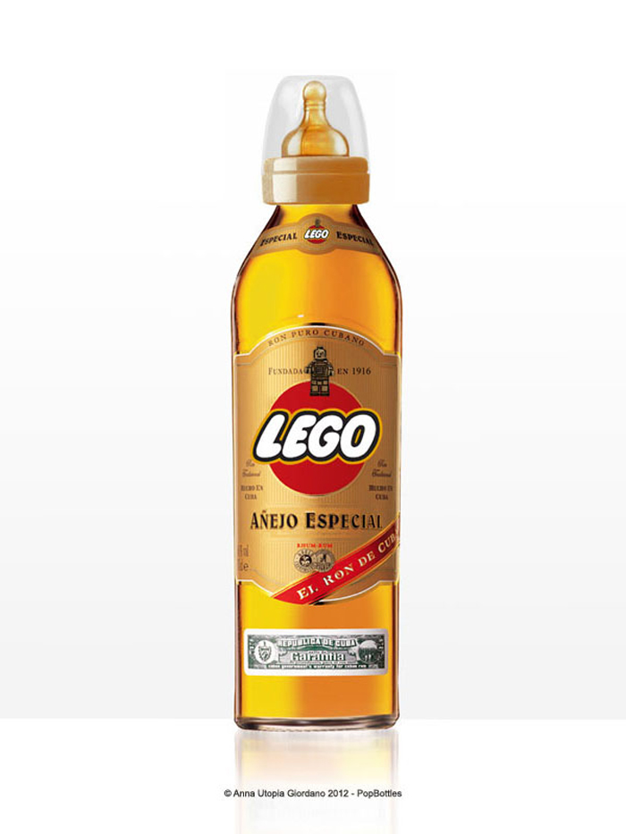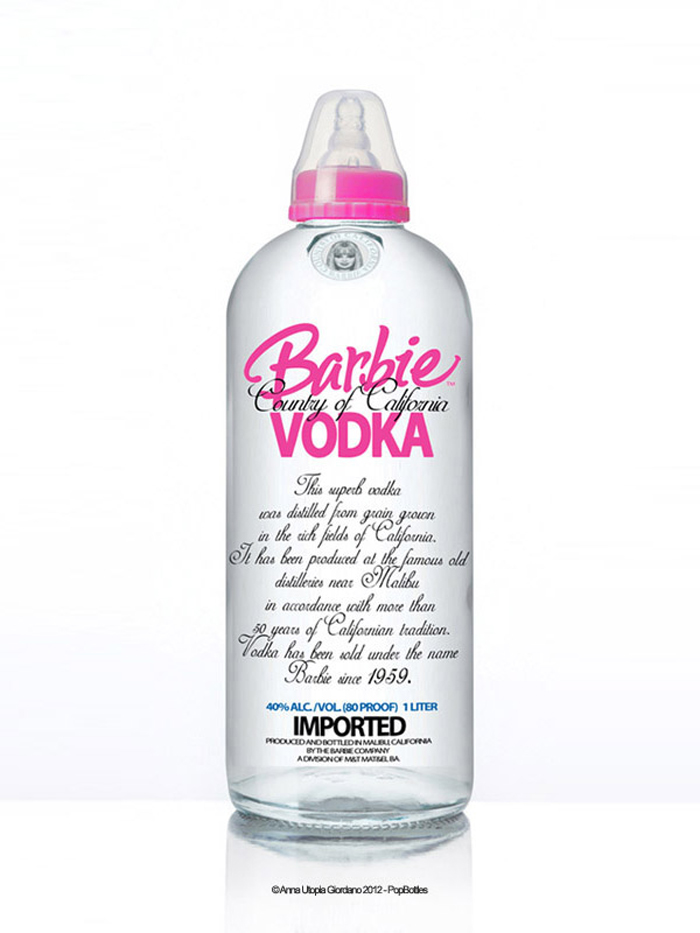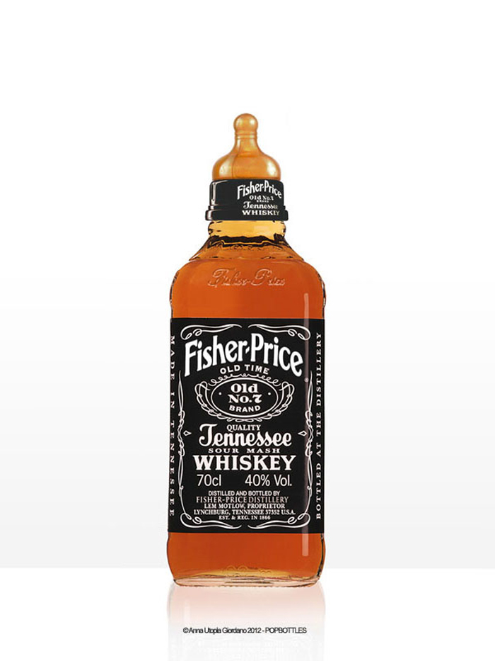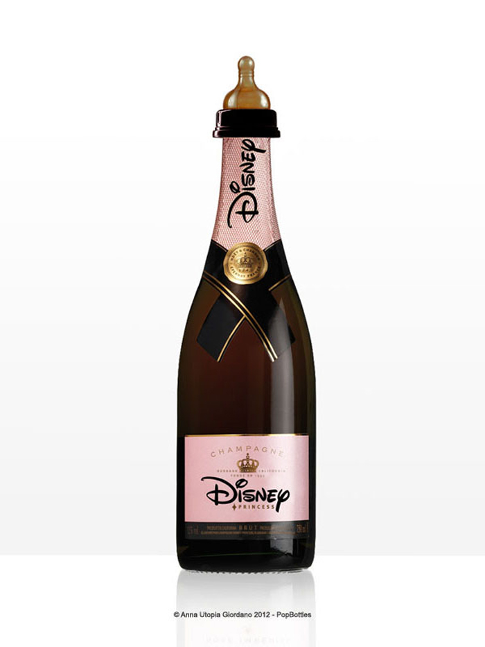Ces biberons design sont signés par Anna Utopia Giordano qui a donc crée ces POPbottles! Le principe est simple. On prend des bouteilles avec une identité visuelle forte et on remplace les logos par ceux de marques de produits pour enfants… Ainsi une célèbre marque de whisky devient une bouteille de Fisher Price, une bouteille de champagne devient un joli biberon Disney, etc… Et vous savez quoi? J’aime!