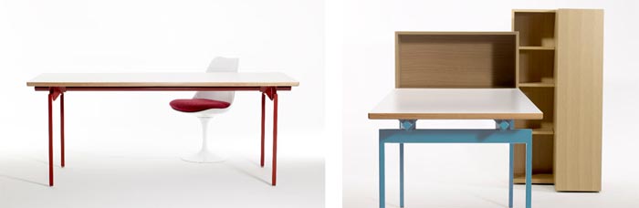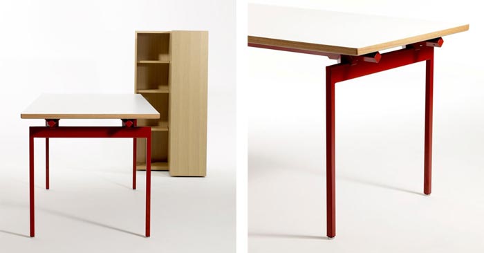 Avec sa forme très minimaliste et ses couleurs flashy pour le piètement, il m’a tout de suite séduite. J’aime ce qui est simple et ce bureau design l’est, assurément. Présenté avec un piètement rouge ou bleu et son plateau blanc à champs en bois, il réduit à son minimum ce dont on a besoin pour faire un bureau parfait : quatre pieds et un plateau. Point. Il s’inscrit directement dans la tendance Less is More (Le moins c’est le mieux) que j’affectionne beaucoup et depuis longtemps.
