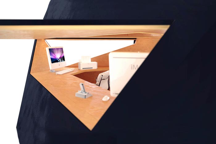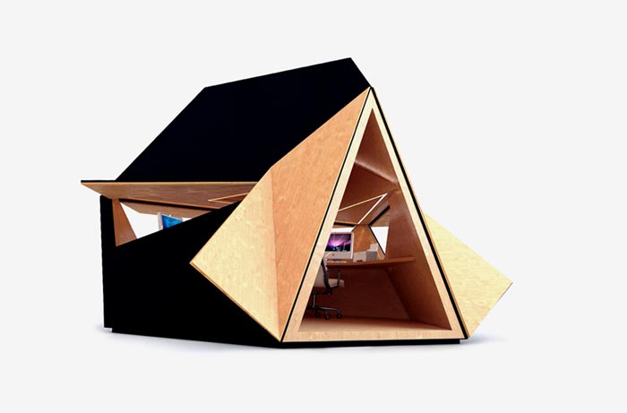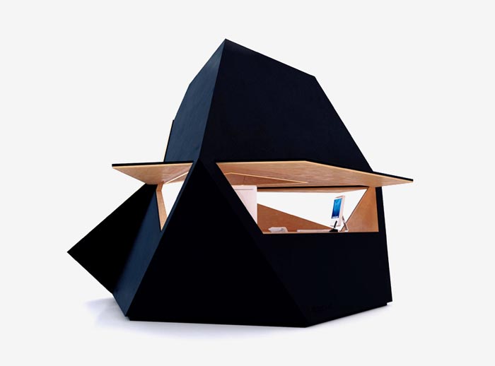 Le bureau design Tetra a été conçu par David Ajasa-Adekunle. Il est disponible dans plusieurs finitions, comme cuivre, zinc, acier ou contreplaqué… Personnellement j’aime bien la version exposée sur les photos de la galerie, avec un revêtement extérieur noir… Ça lui donne de faux airs d’OVNI qui se serait posé dans votre jardin! Non?