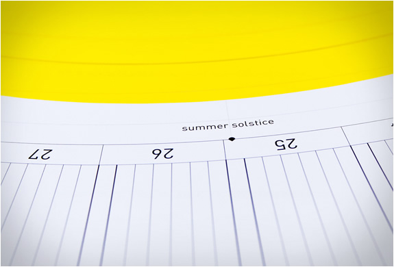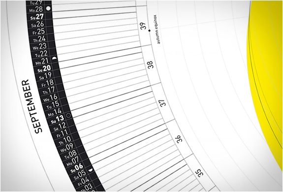 Le calendrier circulaire mural est une invention utile et décorative conçu par le designer Allemand Sören Lachnit. Ce calendrier de format A0 permet d’organiser l’année dans le sens horaire, par semaine, par phases de lune, par mois, et d’afficher la moyenne des heures de soleil.