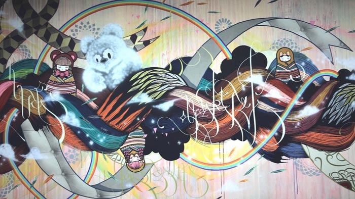 Bref, revenons à nos moutons. La fresque murale a été réalisée par Supakitch et Koralie dans le cadre d’une exposition Metroplastique, la marque crée par les deux artistes. La performance a été immortalisée par Raphaël Hache et Jérôme Lozano sur le titre Euphorie de Leonard de Leonard.