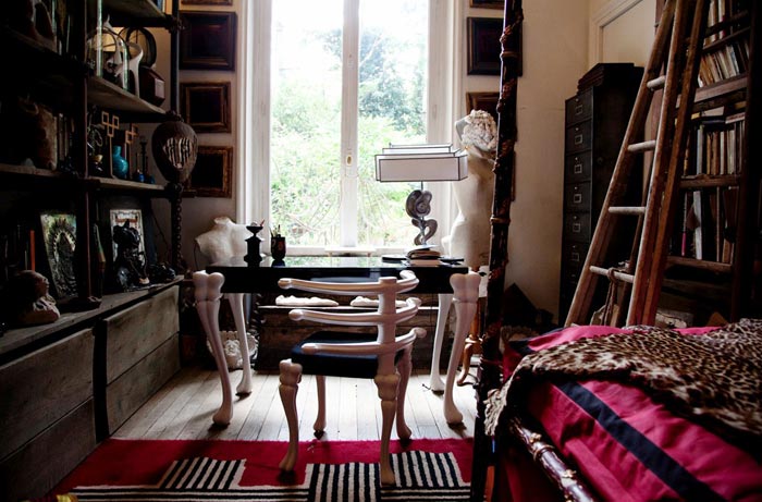 L’appartement de Vincent Darre ressemble un peu à un cabinet de curiosités… L’ambiance est limite surchargée et le mobilier est très très présent avec des pièces fortes comme ce lit avec des montants en formes d’os. Oui, d’os. Perso j’aurai du mal à dormir dans cette atmosphère mais Vincent, lui, ça n’a pas l’air de le gêner! Apparemment, il aime bien les os, d’ailleurs puisqu’on en retrouve un peu partout dans sa maison : la chaise de son bureau ressemble à un torse avec les côtes qui serviraient de dossier, ils servent d’objet de décoration, posé à côté de ses vases ou encore de pied de lampe…