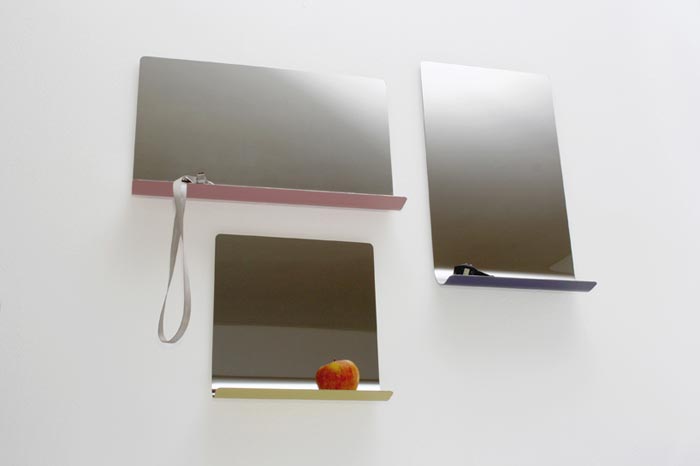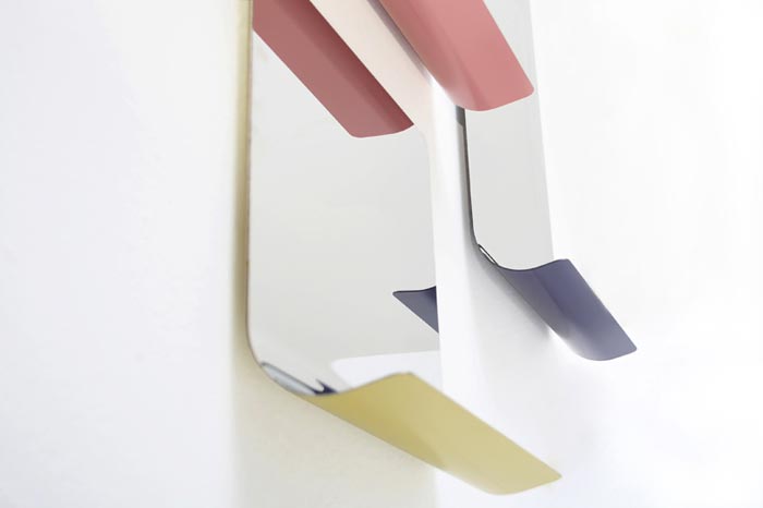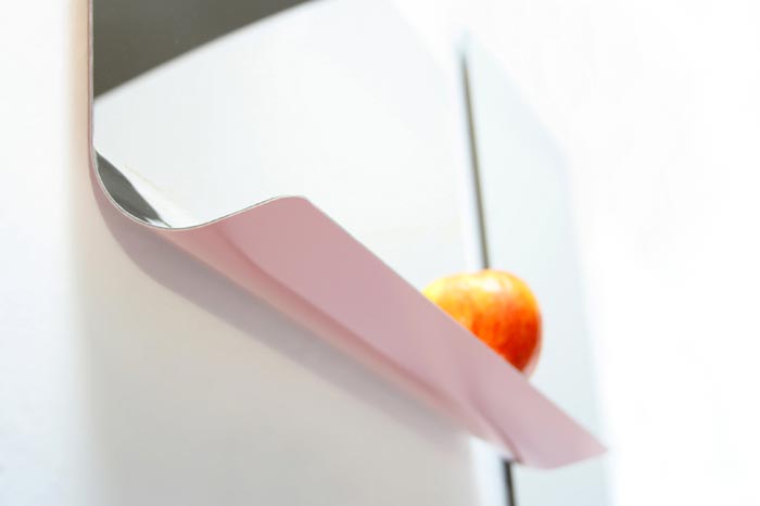 Minimaliste, forcément puisqu’il est composé uniquement d’une simple feuille d’acier inoxydable pliée avec surface réfléchissante. L’envers est peint ce qui laisse entrevoir la couleur puisque la partie étagère de ce miroir design Bent est légèrement recourbée.