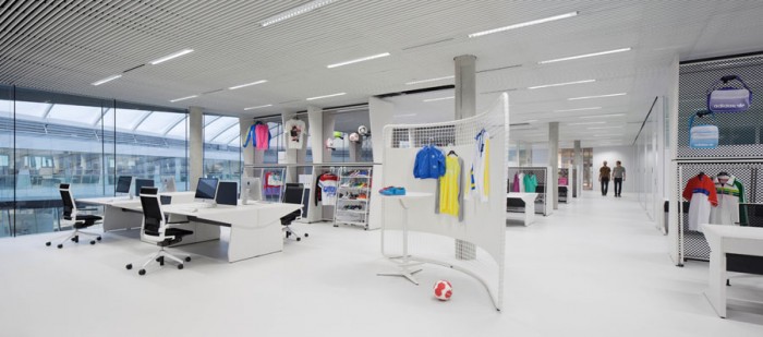 Le cabinet d’architecture Kinzo a offert un projet global en travaillant aussi bien sur l’agencement que sur le mobilier lui-même. Tout ce que vous voyez là a été spécialement conçu pour ce bâtiment. Le mobilier est ultra design mais en même temps on y retrouve les lignes sportives chères au groupe Adidas. Tout est parfaitement intégrer et les cloisons qui délimitent les espaces de travail dans l’open space font penser à du textile pour rappeler les produits de la marque…