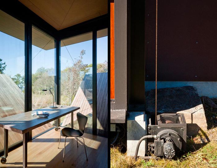 Ce bungalow design a été bâti sur l’île San Juan dans l’état de Washington aux États-Unis. C’est le cabinet Olson Kundig Architects qui a conçu cette petite maison en la pensant de telle façon à ce qu’elle puisse être complètement ouverte sur l’extérieur et qu’elle soit en même temps très sécurisée lorsque personne ne l’occupe.