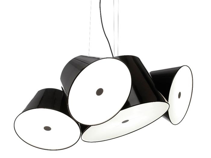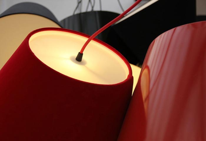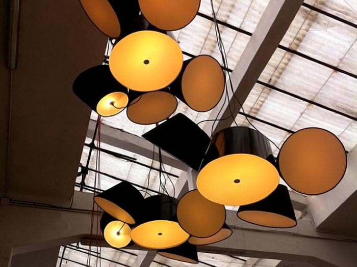 Tamtam est une lampe design suspendue composée de plusieurs abat-jour. Il y a une lampe centrale de 50 cm de diamètre et elle est entourée de plusieurs autres abat-jour qui mesurent chacun environ 35 cm de diamètre. Ensemble, ils forment une sorte de grappe lumineuse qui produit une lumière suffisamment forte pour bien éclairer mais qui n’est pas agressive grâce à des diffuseurs qui sont placés à chaque extrémité de chaque abat-jour.