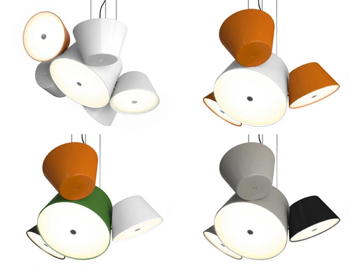 La suspension design Tamtam est réalisée en aluminium laqué et elle existe dans six teintes différentes : noir, blanc, orange, tabac, vert ou gris… Avec évidemment possibilité de mixer les couleurs comme présenté sur une des photos de la galerie…