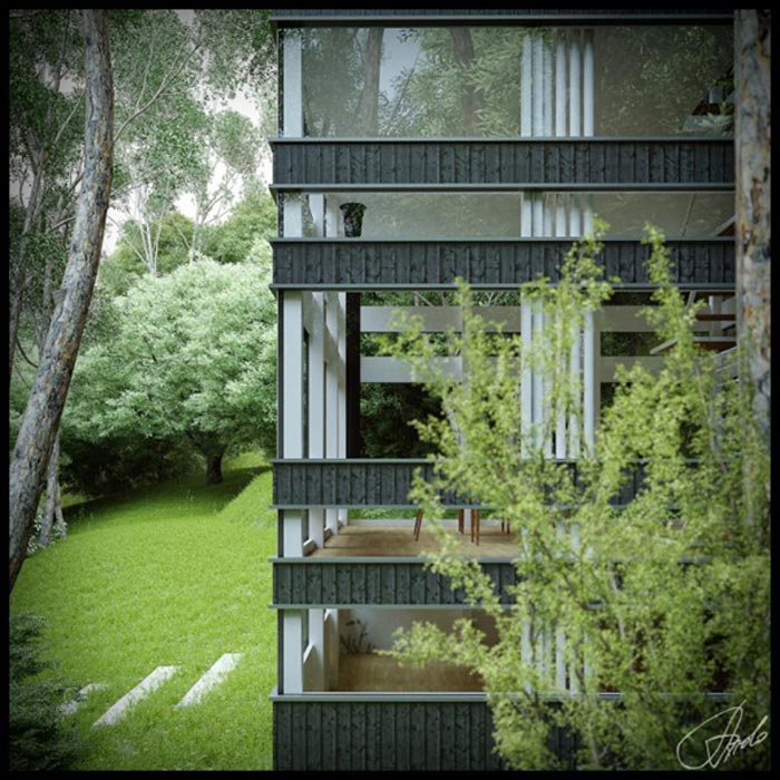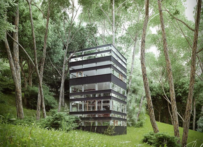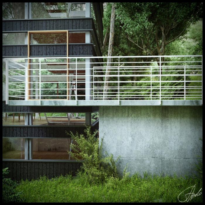 J’aime beaucoup le fait que les façades extérieures soient quasi-entièrement vitrées. Cela permet aux occupants de la maison de profiter un maximum de la vue sur la forêt mais également de faire entrer un maximum de lumière : la maison étant entièrement dans les bois, la luminosité n’est pas franchement excellente, donc toutes ces baies vitrées sont vraiment le bienvenu!