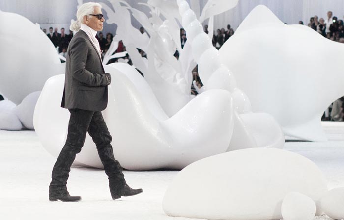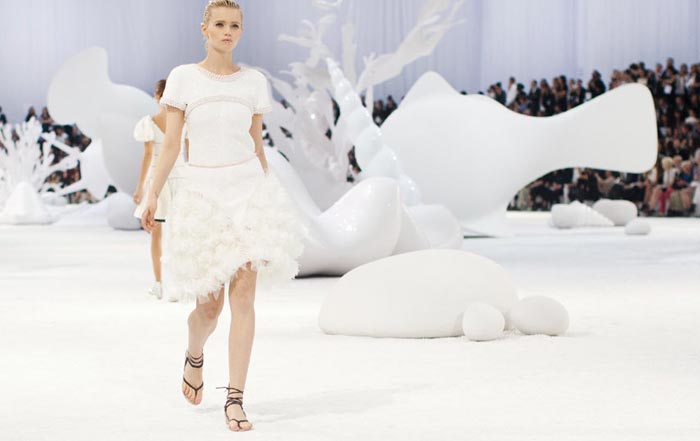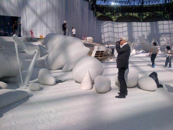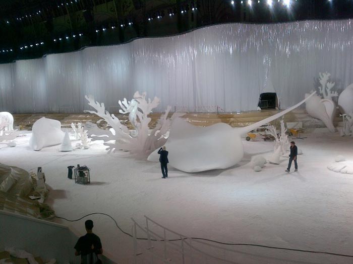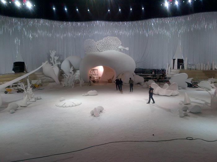 Karl Lagerfeld voulait des formes marines, des poissons, des coquillages, de la féérie et il a fait appel à Zaha Hadid pour recréer cet imaginaire là… Vous avez ici un aperçu de ce qu’a été le montage de ces décors juste avant le show Chanel.