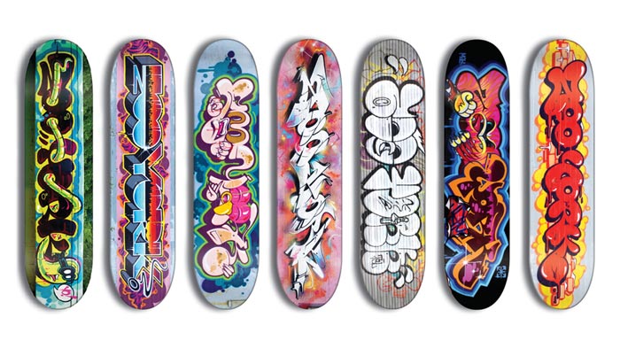 Ces sept planches de skate sont issues de la collaboration entre RIME et TheSevenLetter et ont été conçues pour les skaters Zéred Bassett, Brandon Westgate, Aaron Suski, Chaz Ortiz, Eli Reed, Forrest Kirby et Ron Deily… Niveau esthétique, elles reprennent les codes des graffitis ZOOYORK