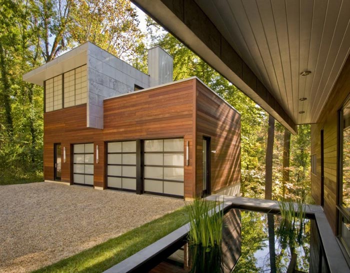 Cette maison design pensée par Robert Gurney Architects est située dans le maryland aux États-Unis. Ce qui en fait la force c’est qu’elle est complètement noyée dans les bois et surtout qu’elle y est parfaitement intégrée. Avec ses larges baies vitrées, son aménagement résolument moderne et son couloir de nage, je la trouve vraiment très réussie. Son bardage bois casse un peu l’image que l’on se fait de ces bâtiments très carrés et très design… Bref, j’aime!