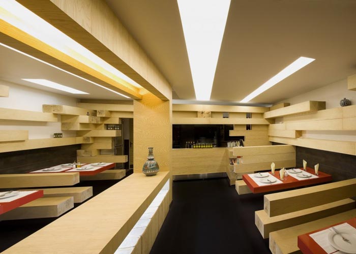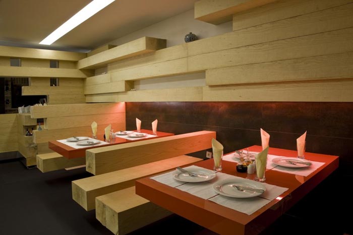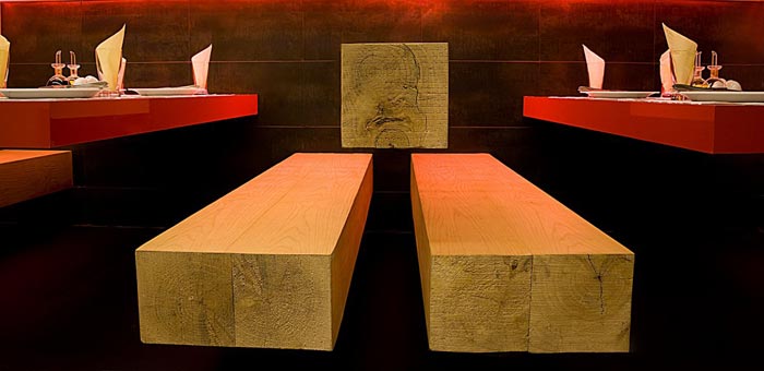 C’est pourtant le défi qu’a relevé les designers de Expose Architecture en imaginant le restaurant Ator de Téhéran. Le cahier des charges était assez complexe puisque les architectes ne disposait que d’un espace de 50 m2 et que le propriétaire des lieux voulaient que l’aménagement soit avant tout pratique à nettoyer et dégage une sensation d’espace importante. Du coup les équipes de Expose Architecture ont opté pour du mobilier que je qualifierai de suspendu avec de grandes poutres en bois scellées dans les murs pour constituer les tables ainsi que les bancs.