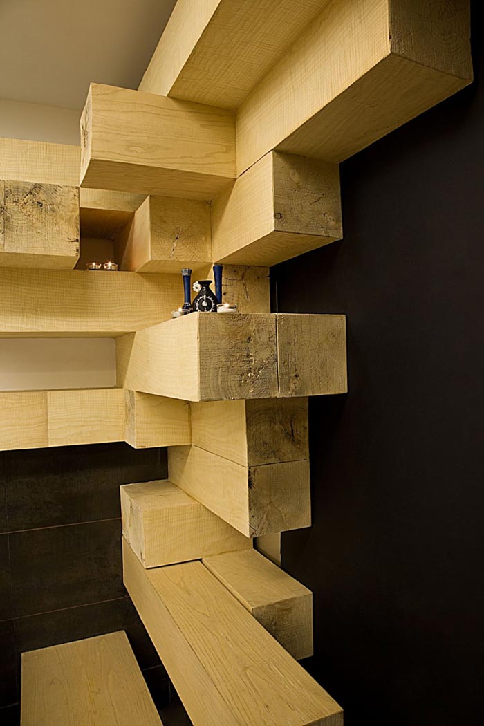 La structure murale est toute aussi intéressante puisqu’elle est, elle aussi, constituée de ces grosses poutres en bois clair qui semblent enchevêtrées et emboitées les unes dans les autres… Je regrette juste les petits éléments de déco qui sont posés dessus. Je les trouve beaucoup trop petits et finalement pas super utiles…
