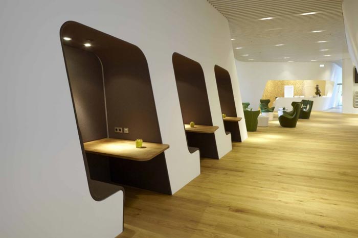 Le VIP WING a été imaginé par les designers Erich Gassmann et Tina Aßmann… Et le résultat est vraiment plus que plaisant… Design mais chaleureux, ce salon VIP de l’aeroport de Munich est à la fois chic, élégant et moderne. Tout ce que j’aime. En fait, on dirait plus un vrai bar qu’une salle d’attente même si dans ce cas précis, les deux fonctions sont évidemment mixées.