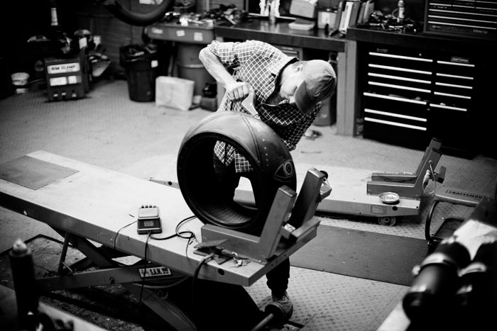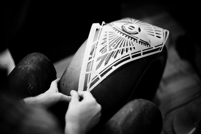 Figurez vous que Scott Campbell s’en est pris à un pneu Pirelli pour en sculpter lui-même les dessins. Le résultat est évidemment magnifique, dans l’esprit des plus beaux tatoos old school américains. J’adore.