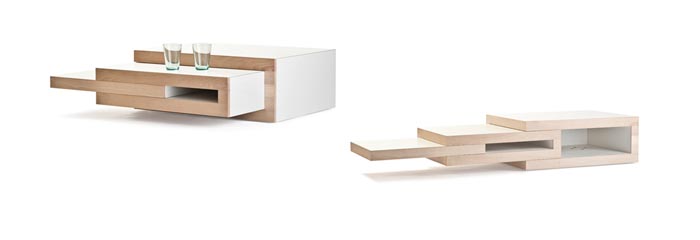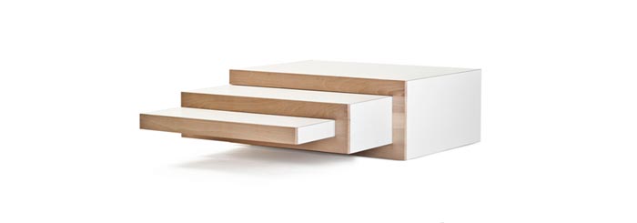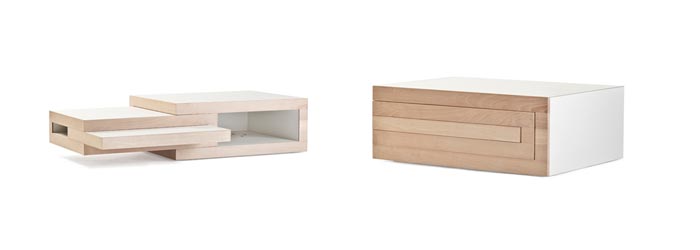 Mais pas n’importe laquelle! Je parle de REK, la table basse design imaginée par le designer Reinier de Jong. Fermée, elle ressemble à un module compact rectangulaire, tout ce qu’il y a de plus basique. Mais lorsque l’on se décide à l’ouvrir, on découvre trois modules qui s’ouvrent, dans un sens ou dans l’autre et qui vous donne une multitude de possibilité pour la transformer et l’adapter à vos besoins…